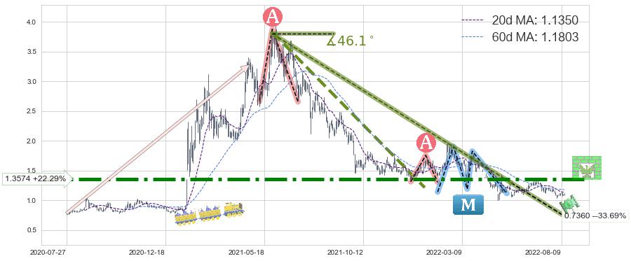 从2021-05-31至2022-01-11,共包含155个交易日,阶段股价下跌-71.24%,阶段股价变动位移路程比: 1 : 7,下跌趋势角度: 59.4