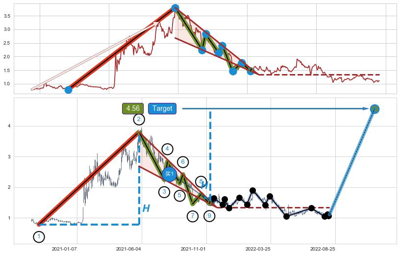 ➢ 最小中继整理涨幅→𝐇: 3.010 (𝐇楔型旗杆的长度:楔型起点→顶点)