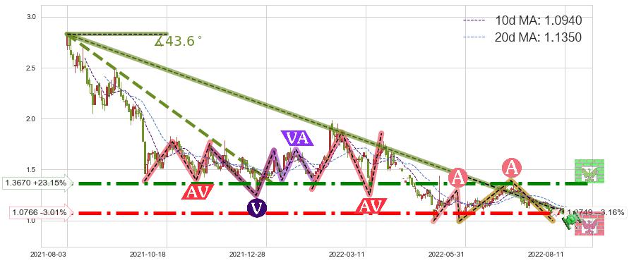 ♘ 阻力价格位1.3670,可信任强度90.15%,距离最后交易2022-08-12形成的收盘价格1.1100相差 +23.15%