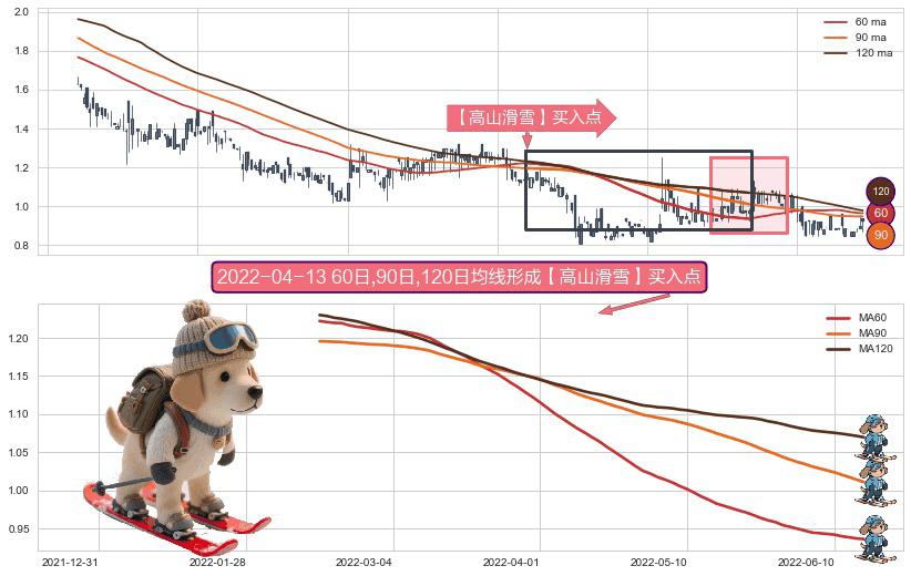 ⚀ 2022-02-17日-2022-06-16日显现 60日-90日-120日均线 【高山滑雪】买入点 看多信号,后市看涨,买入