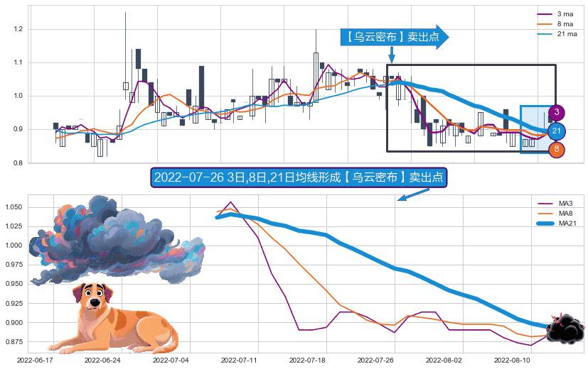 ⚀ 2022-07-06日-2022-08-12日显现 3日-8日-21日均线 【乌云密布】卖出点 看空信号,后市看跌,卖出