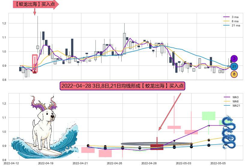 ⚀ 2022-04-28日显现 3日-8日-21日均线 【蛟龙出海】买入点 看多信号,后市看涨,买入