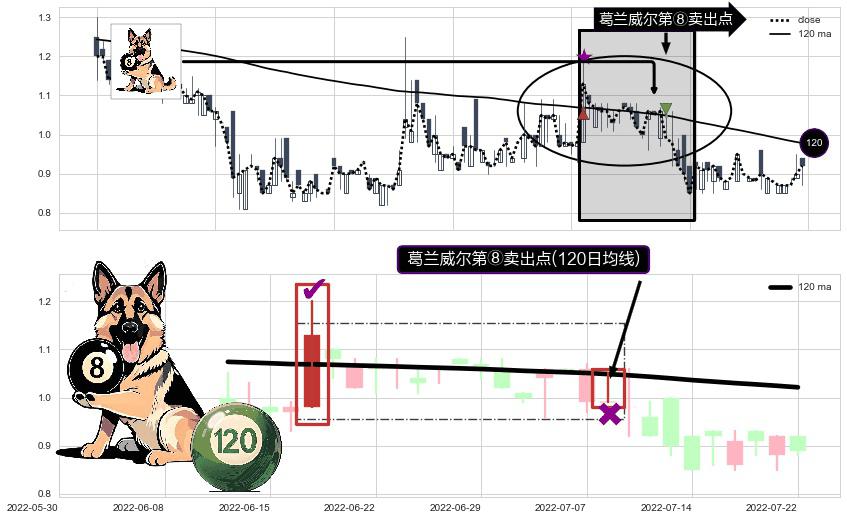 ⚀ 2022-07-08-日显现 葛兰威尔均线 120日均线 第⑧卖出点 下降趋势的中继信号,后市看跌,卖出信号