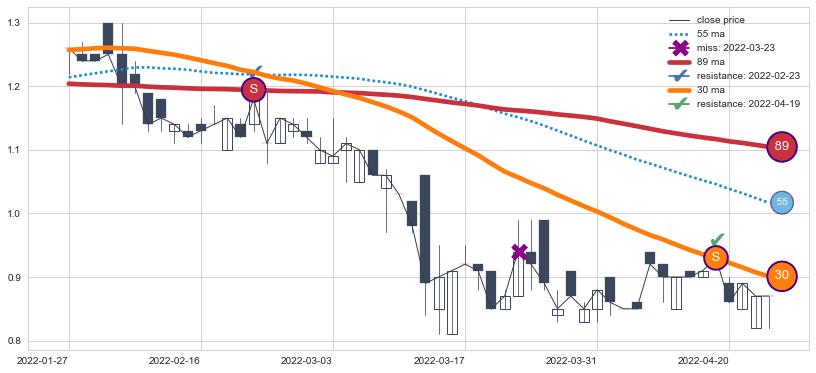 ⚂ 2022-06-17-日均线向上突破,2022-07-08-日重新下穿均线破位,均线阻力再次生效