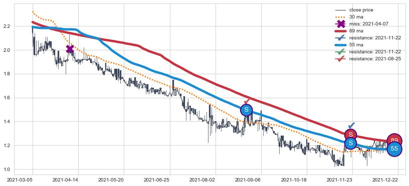 ⚅ 卖点向下突破均线后,价格走势有持续向下的迹象,但动能稍显不足,迟迟不能远离均线
