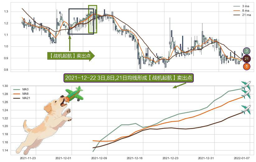 ⚀ 2021-12-07日-2022-01-06日显现 3日-8日-21日均线 【战机起航】卖出点 看空信号,后市看跌,卖出