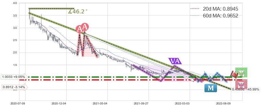 ➣ 2020-07-23-2022-04-19下跌趋势存在反转上涨[机会],其原下跌趋势的阻力位(0.49686)已被突破[强支撑信号],原下跌趋势角度: 46.2˚