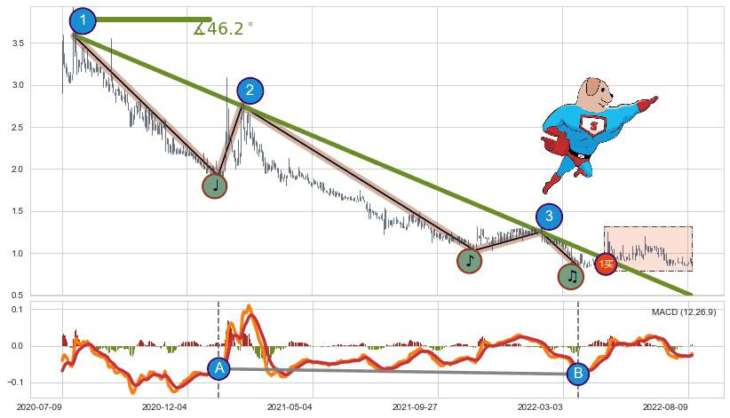 ➣ 【MACD】缠论走势出现【常规背离 & 反转信号】背离程度28.47%,背离夹角角度67.0˚,背离程度较大
