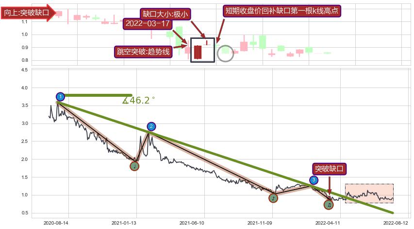 ➣ 突破缺口形成后,后续k已经超过14根,跳空突破趋势线关键点后, 出现【完全回踩】迹象,短期收盘价回补缺口第一根k线高点