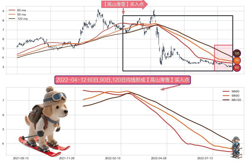 形态多维评估: ⚀ 2021-12-09日-2022-08-12日显现 60日-90日-120日均线 【高山滑雪】买入点 看多信号,后市看涨,买入