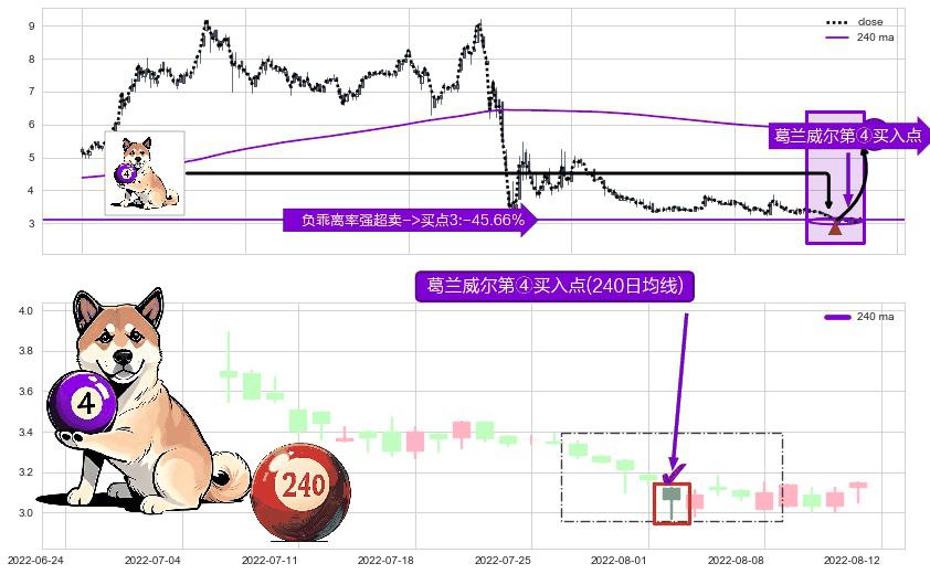 形态多维评估: ⚀ 2022-08-02-日显现 葛兰威尔均线 240日均线 第④买入点 下降趋势均值回复的短线反弹信号,后市看涨,买进信号