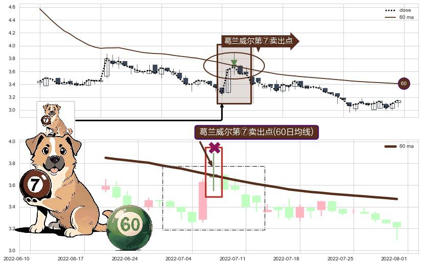 形态多维评估: ⚀ 2022-07-06-日显现 葛兰威尔均线 60日均线 第⑦卖出点 下降趋势的中继信号,后市看跌,卖出信号