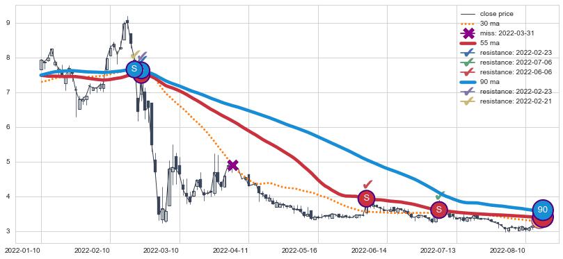 下跌趋势2022-01-10-2022-08-12,均线90, 55确认关键阻力4处