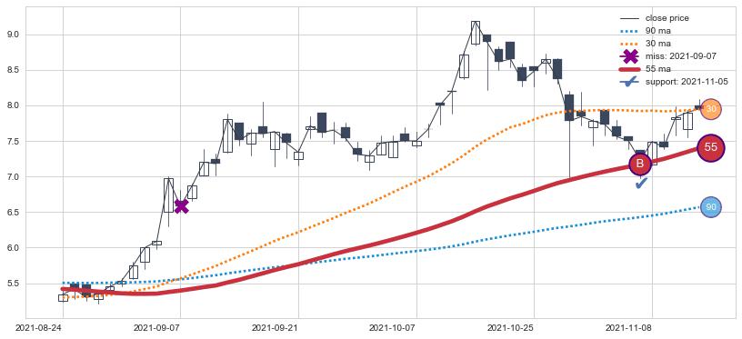 上涨趋势2021-08-24-2021-11-12,均线55确认关键支撑1处