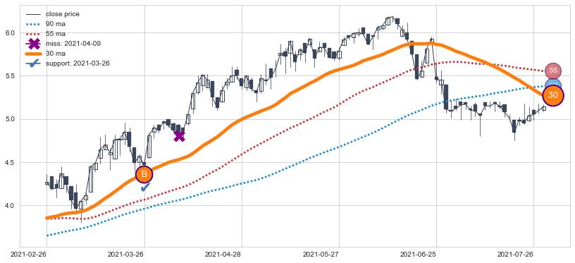上涨趋势2021-02-26-2021-07-28,均线30确认关键支撑1处
