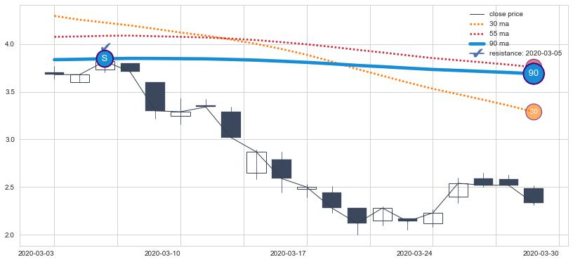 下跌趋势2020-03-03-2020-03-30,均线90确认关键阻力1处