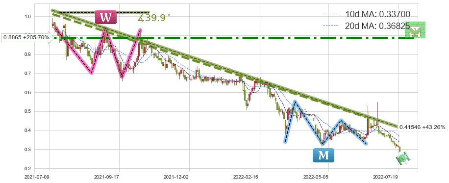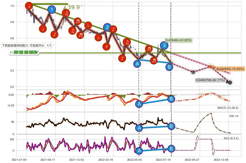 ♘ 在最后的下跌阶段2021-07-13至2022-07-20,存在 持续未破位的阻力位 ,阻力价格0.41546,可信任强度88.70%,其距离最后价格0.29000相差 +43.26%