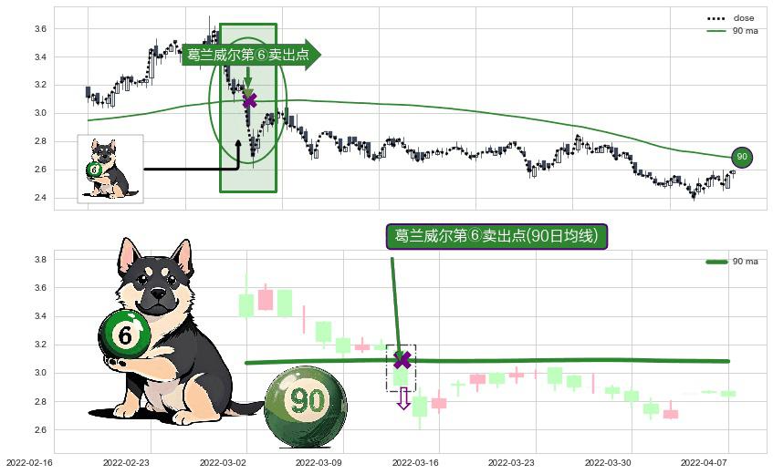 形态多维评估: ⚀ 2022-03-14-日显现 葛兰威尔均线 90日均线 第⑥卖出点 走势反转见顶信号,后市看跌,卖出信号