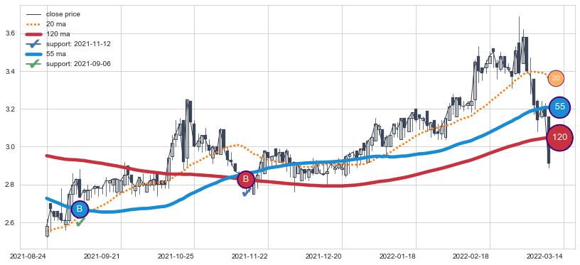 上涨趋势2021-08-24-2022-03-14,均线120, 55确认关键支撑2处