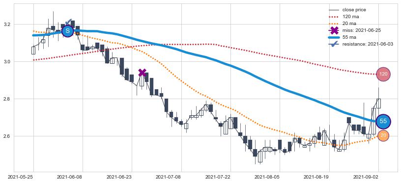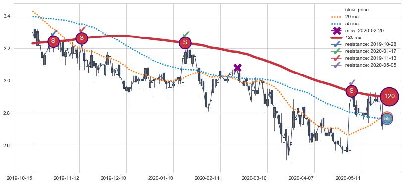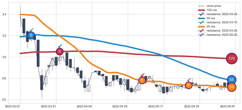 下跌趋势2022-03-07-2022-06-07,均线120, 20, 55确认关键阻力4处