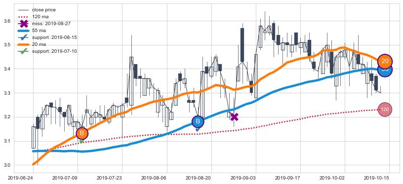 上涨趋势2019-06-24-2019-10-15,均线20, 55确认关键支撑2处