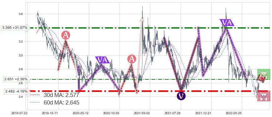 ♘ 阻力价格位2.651,可信任强度40.49%,距离最后交易2022-08-12形成的收盘价格2.590相差 +2.36%