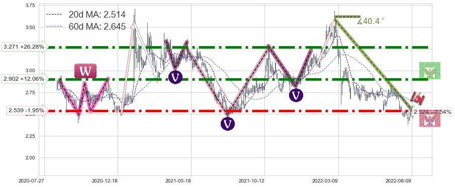 ♘ 阻力价格位2.902,可信任强度85.43%,距离最后交易2022-08-12形成的收盘价格2.590相差 +12.06%