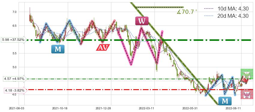 ♘ 阻力价格位4.57,可信任强度50.67%,距离最后交易2022-08-12形成的收盘价格4.35相差 +4.97%