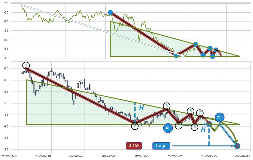 ➣ 【未确认突破,预测即将形成突破】下降三角形整理起点:2022-01-19, 预测突破点:2022-08-17,形态共139交易日