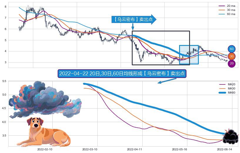 ⚀ 2022-03-02日-2022-06-10日显现 20日-30日-60日均线 【乌云密布】卖出点 看空信号,后市看跌,卖出
