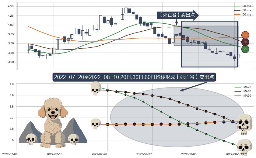 ⚀ 2022-07-21-日至2022-08-10-日显现 20日-30日-60日均线 【死亡谷】卖出点 看空信号,后市看跌,卖出