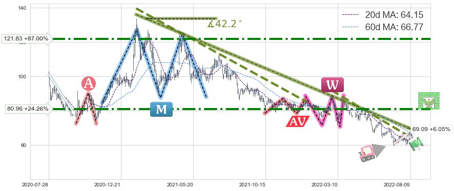 ♘ 阻力价格位80.96,可信任强度78.22%,距离最后交易2022-08-12形成的收盘价格65.15相差 +24.26%