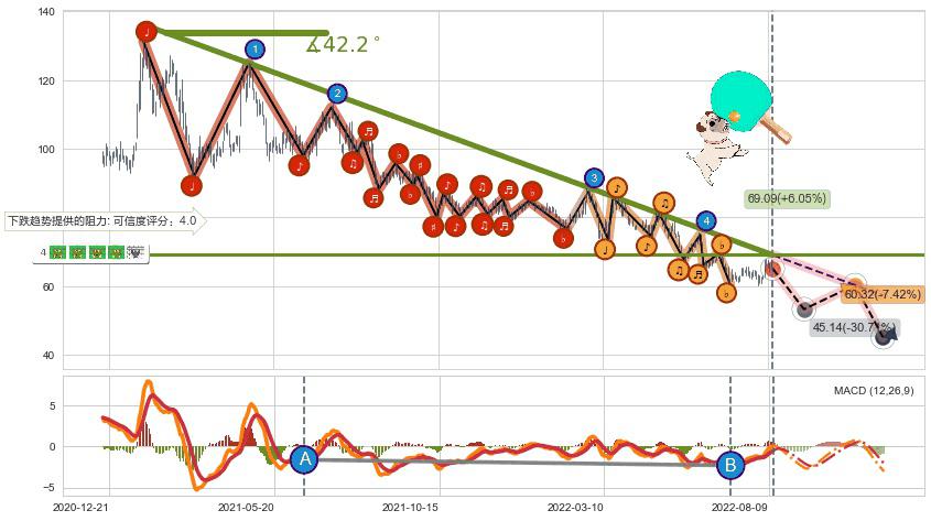 ♘ 在最后的下跌阶段2021-01-21至2022-08-04,存在 持续未破位的阻力位 ,阻力价格69.09,可信任强度82.26%,其距离最后价格65.15相差 +6.05%