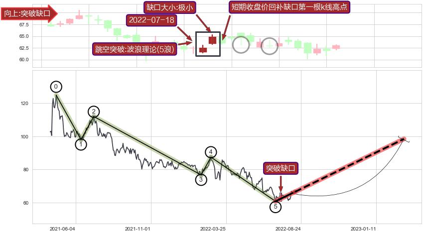➢ 突破缺口形成后,后续k已经超过14根,跳空突破波浪理论(5浪)关键点后, 出现【完全回踩】迹象,短期收盘价回补缺口第一根k线高点