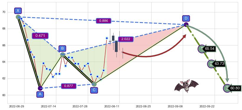 ➣ 未完成【蝙蝠】形态起点X: 2022-06-27, 已到达C点: 2022-08-01, 预测最终D点: 2022-09-09, 共49交易日