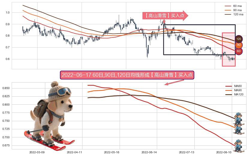 形态多维评估: ⚀ 2022-04-19日-2022-08-12日显现 60日-90日-120日均线 【高山滑雪】买入点 看多信号,后市看涨,买入