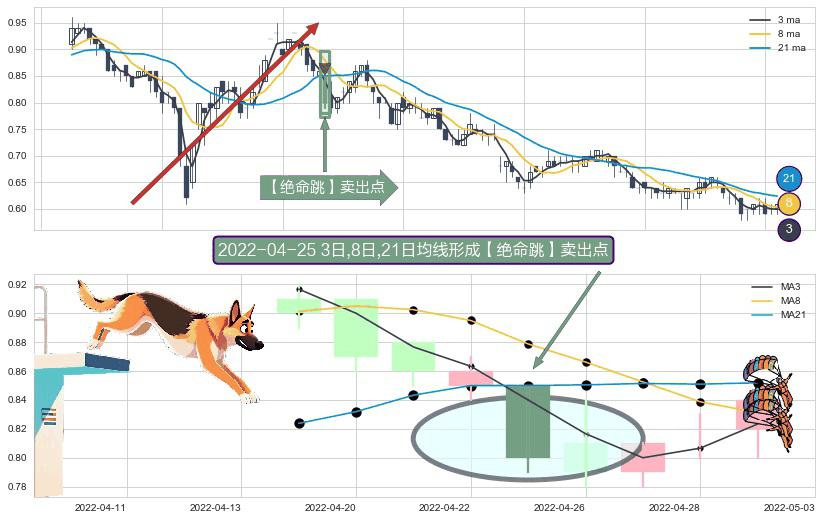 形态多维评估: ⚀ 2022-04-25日显现 3日-8日-21日均线 【绝命跳】卖出点 看空信号,后市看跌,卖出