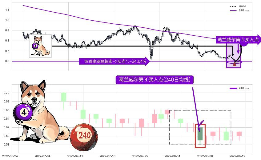 形态多维评估: ⚀ 2022-08-04-日显现 葛兰威尔均线 240日均线 第④买入点 下降趋势均值回复的短线反弹信号,后市看涨,买进信号