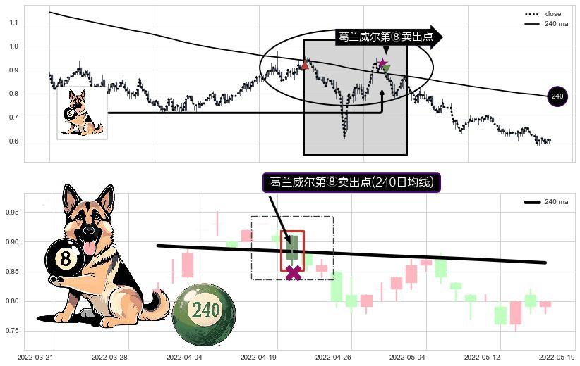 形态多维评估: ⚀ 2022-04-20-日显现 葛兰威尔均线 240日均线 第⑧卖出点 下降趋势的中继信号,后市看跌,卖出信号