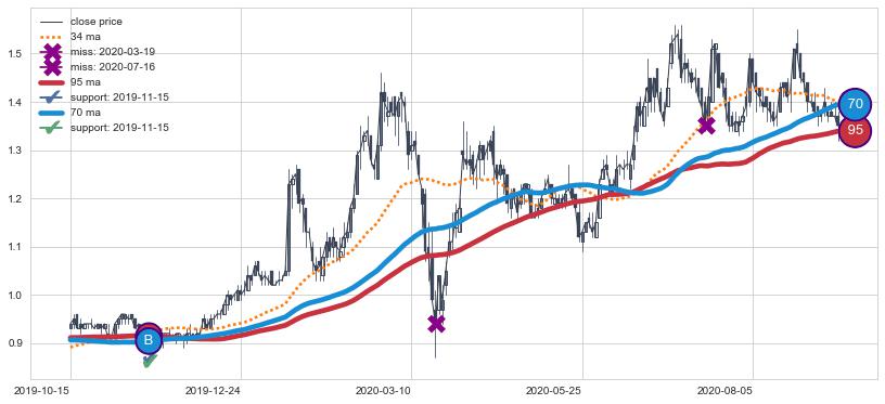 上涨趋势2019-10-15-2020-09-09,均线70, 95确认关键支撑1处