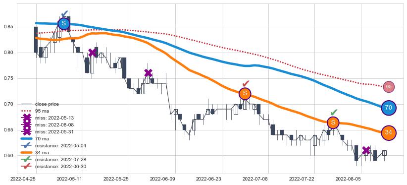 下跌趋势2022-04-25-2022-08-12,均线34, 70确认关键阻力3处