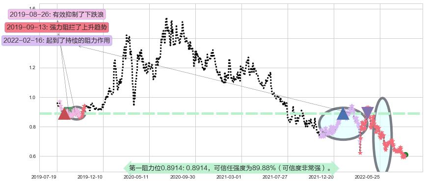 ♘ 阻力价格位0.8914,可信任强度89.88%,距离最后交易2022-08-12形成的收盘价格0.6100相差 +46.12%