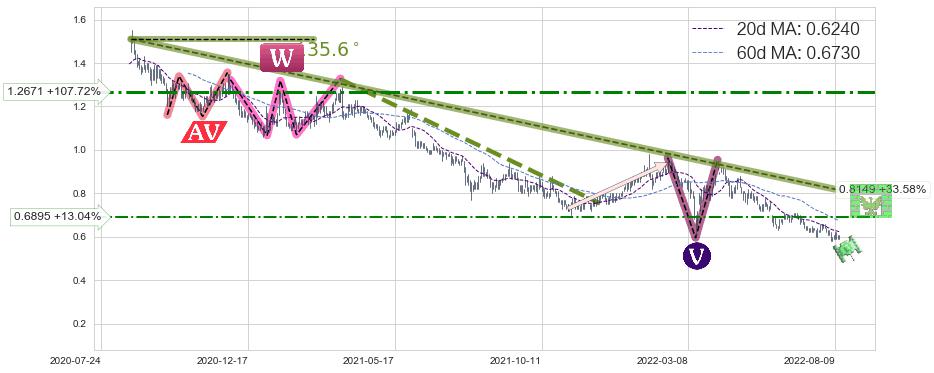 ♘ 阻力价格位0.6895,可信任强度36.24%,距离最后交易2022-08-12形成的收盘价格0.6100相差 +13.04%