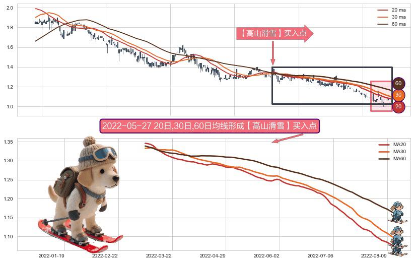 形态多维评估: ⚀ 2022-03-08日-2022-08-12日显现 20日-30日-60日均线 【高山滑雪】买入点 看多信号,后市看涨,买入
