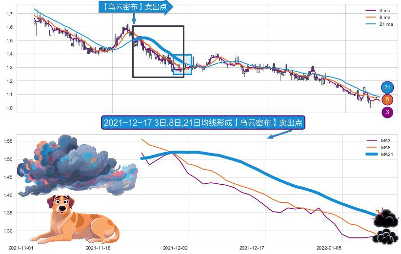 形态多维评估: ⚀ 2021-11-24日-2022-01-12日显现 3日-8日-21日均线 【乌云密布】卖出点 看空信号,后市看跌,卖出