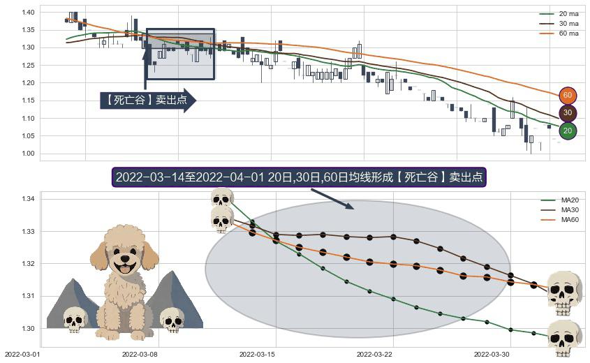 形态多维评估: ⚀ 2022-03-15-日至2022-04-01-日显现 20日-30日-60日均线 【死亡谷】卖出点 看空信号,后市看跌,卖出