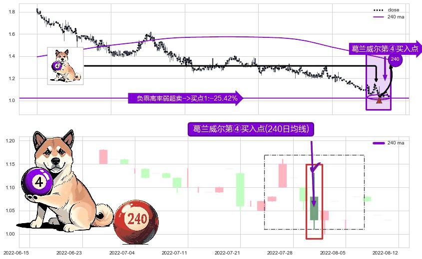 形态多维评估: ⚀ 2022-08-01-日显现 葛兰威尔均线 240日均线 第④买入点 下降趋势均值回复的短线反弹信号,后市看涨,买进信号