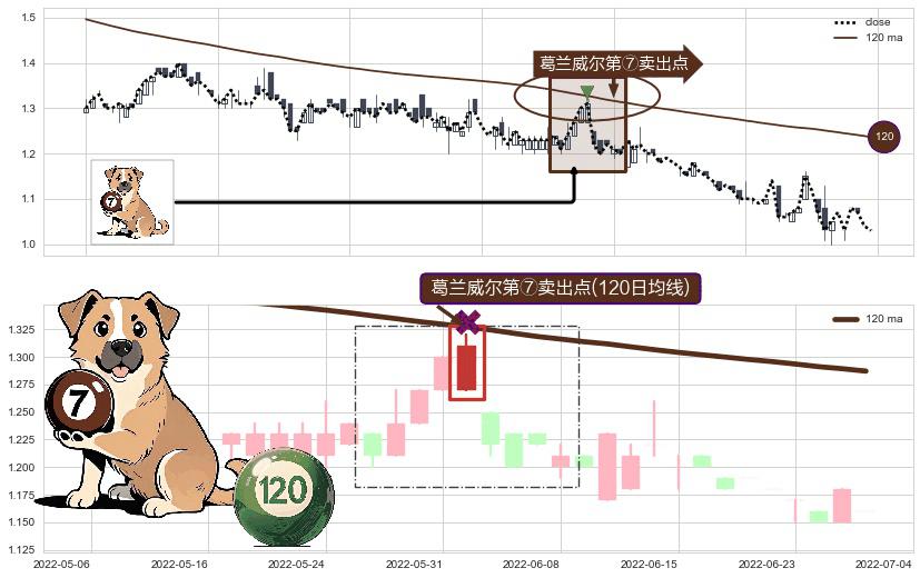 形态多维评估: ⚀ 2022-06-01-日显现 葛兰威尔均线 120日均线 第⑦卖出点 下降趋势的中继信号,后市看跌,卖出信号