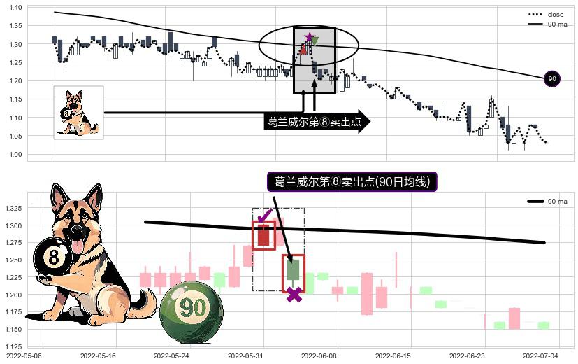 形态多维评估: ⚀ 2022-06-02-日显现 葛兰威尔均线 90日均线 第⑧卖出点 下降趋势的中继信号,后市看跌,卖出信号
