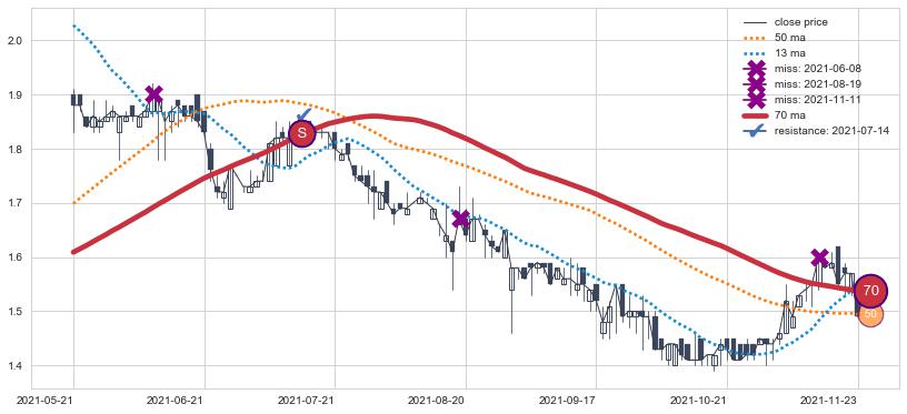 下跌趋势2021-05-21-2021-11-23,均线70确认关键阻力1处